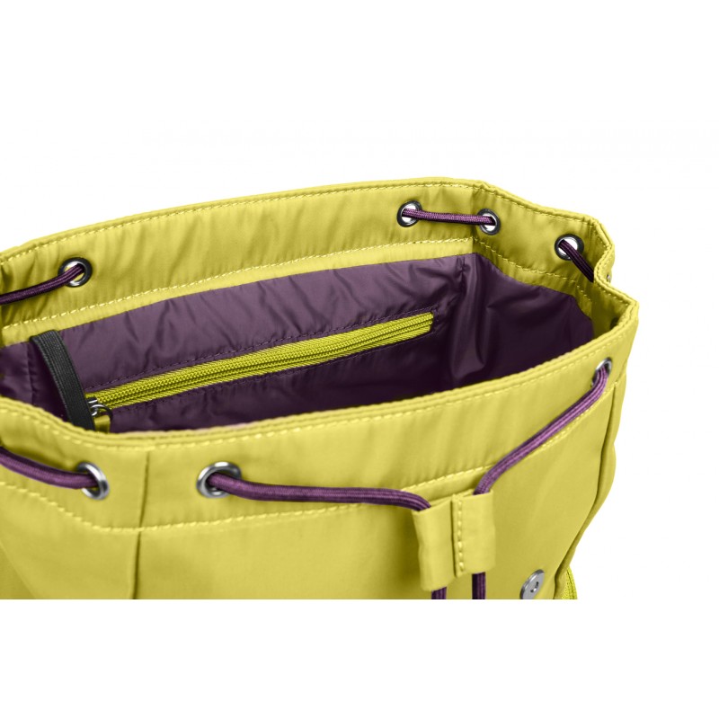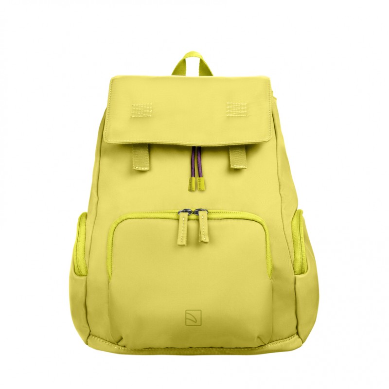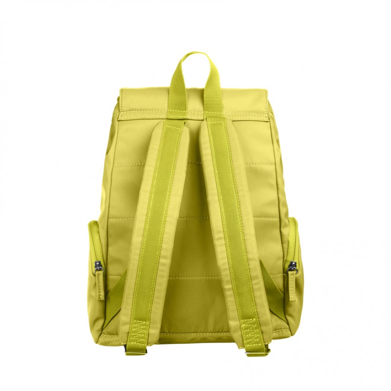 Mochila em tecido de nylon, tem 1 bolso frontal e 2 laterais, todos com fecho zip. O revestimento interior, prespontos e o cordão de fecho são em cor contrastante. No interior tem um pequeno bolso com zip, a pala externa prende com 2 molas magnéticas, que tem 2 posições possíveis para proporcionar capacidade de expansão. Dimensões exteriores: 30 x 40 x 13 cm.